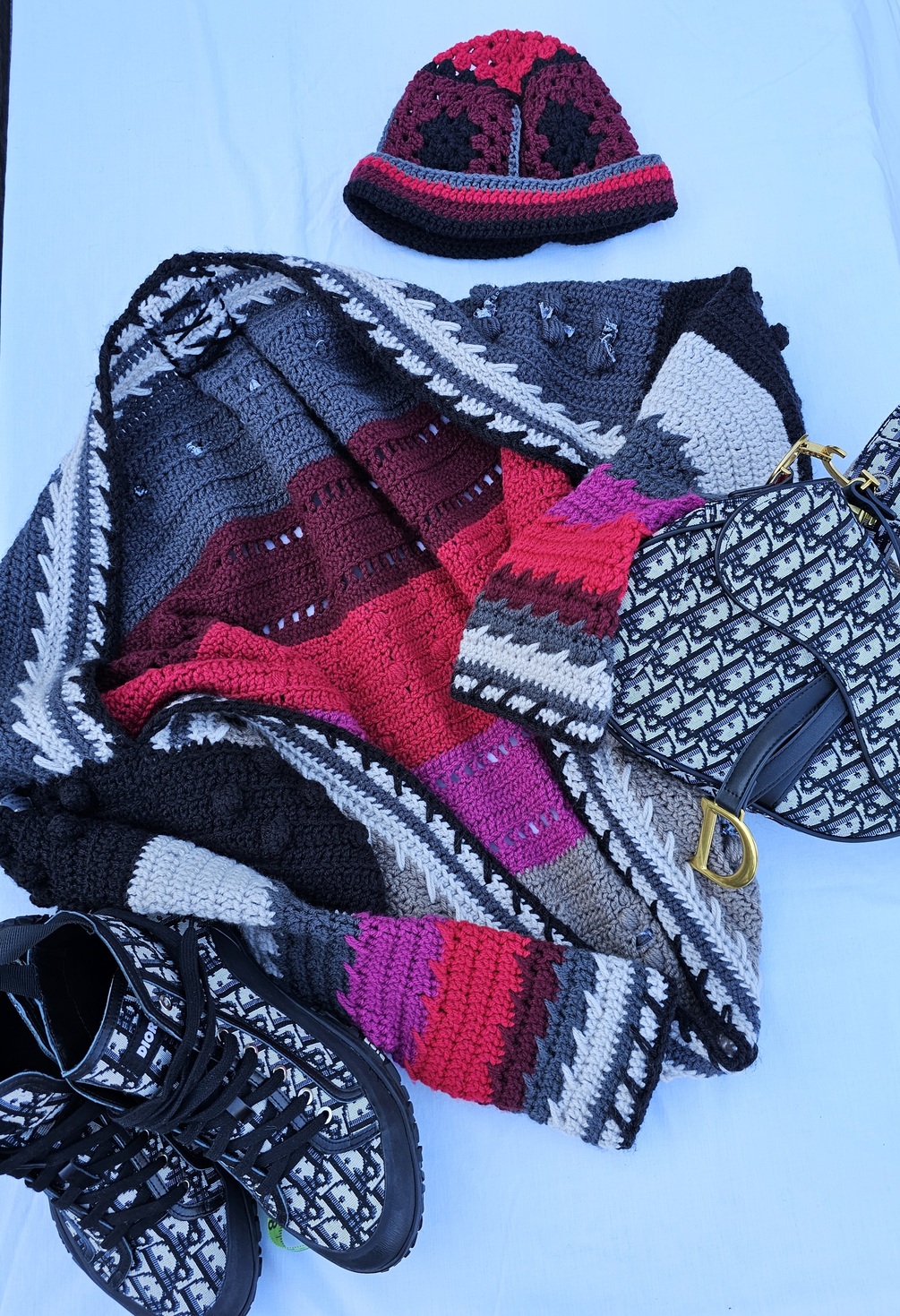 Very detailed beautiful stitches and color block design. Dolman sleeves and open drape effect. Scrunchable.